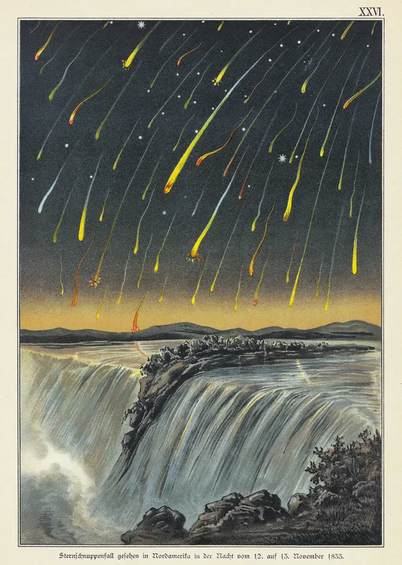 I believe that pairing this audio with this image emphasizes the idea of light found in both pieces, creating a story of sorts that the lights from this meteor shower over a hundred years ago can guide us today through space and through time. I think the music that accompanies the poetry also works to push the “story” forward, there is a sense of dread in some of the rhythms that I think speak to an idea of being pushed over a (metaphorical) waterfall (or otherwise into some precarious situation) while the voice assures us that the lights above will guide the audience to safety.
