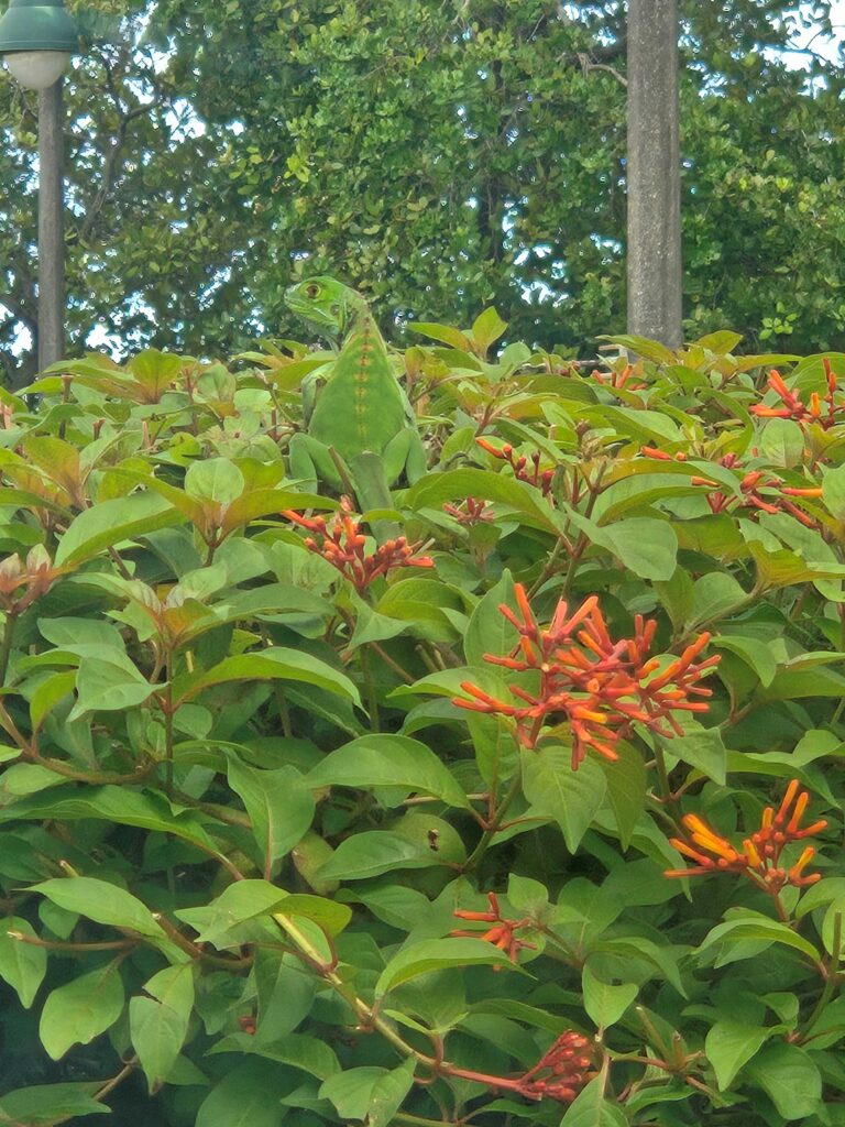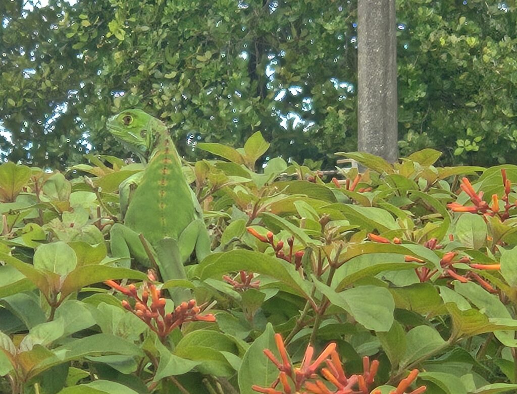 This unexpected photo was taken while on a lunchbreak. I was enjoying the weather, people watching, and finding my center before going back to that day’s Broward Children’s Literature conference. Lo and behold, I spied with my little eye…something green! Hidden among the green leaves of a brilliantly colored firebush, our four legged friend is just sun-bathing. As he looks back, and almost side smiles, nature hit’s me like a ton of bricks. Smiling, and sharing this picture with my husband and kids, I walked back into the conference with a pep in my step. The yellow tint around it’s eye, the bright green hue of its scaly body, and that powerful pose, made lunchtime anything but boring. Although he was trying to stay lost in the bush, he was more obvious than he would have liked. Yes, definitely a sight to see! Adding that final touch of off-centered cropping, incorporating the rule of thirds makes seeing and believing Iggy more prominent than the original. Though the original was just as entertaining, the cropped image made him much easier to see and appreciate.