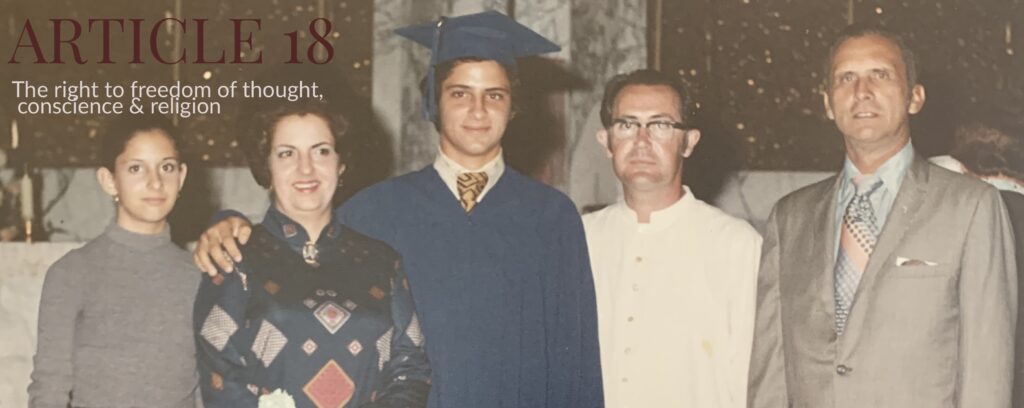 Hey Viviana, what a lovely photo! Graduations are such emotional events, and the range of expressions in the photo really complements the themes of freedom and individuality in the article you chose. The differing fonts and colors also contrast nicely. My only suggestion would be to maybe make the color for “Article 18” a little lighter so it stands out more against the background. Otherwise, very nice!