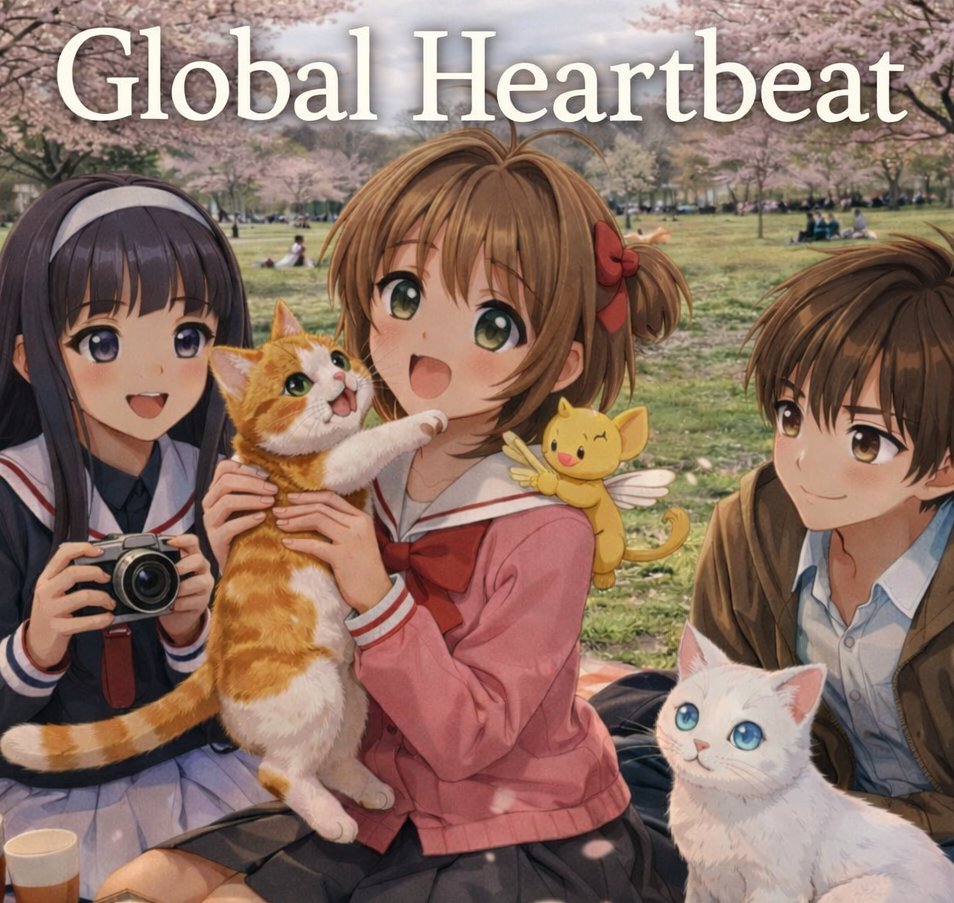 Image : “Global Heartbeat” AI‑generated anime image using the prompt: “Cherry blossom background with friends, family and cats for the Global Heartbeat” by ChatGPT, February 2026.