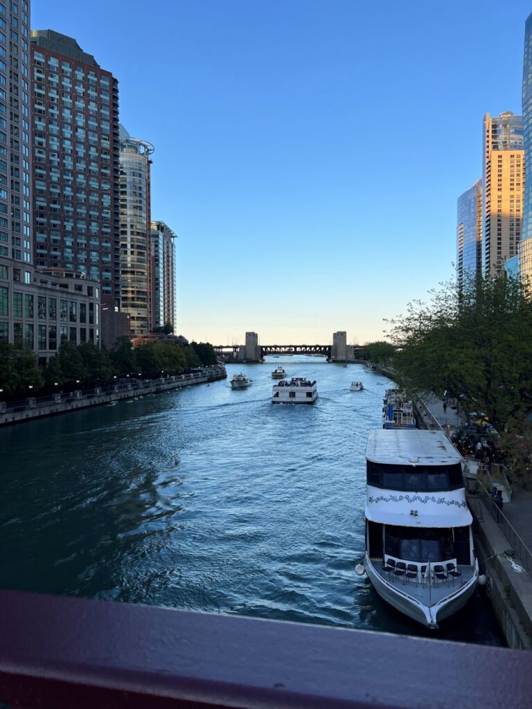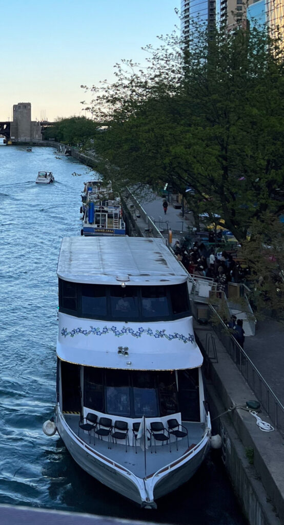 I took this photo during a trip to Chicago in May of last year. No matter what time of day I walked past the river, there were always architecture boat tours taking place. The original photo captures many aspects of the city, including the river, buildings, boat tours, and the setting sun. In the cropped version, I chose to emphasize one of the boat tours. Cropping the photo shifts the narrative from a general city landscape to a personal city experience by focusing on the line of people waiting to board. Details, like the flowers on the boat and people taking a stroll, become more focal and tell a more individual story.