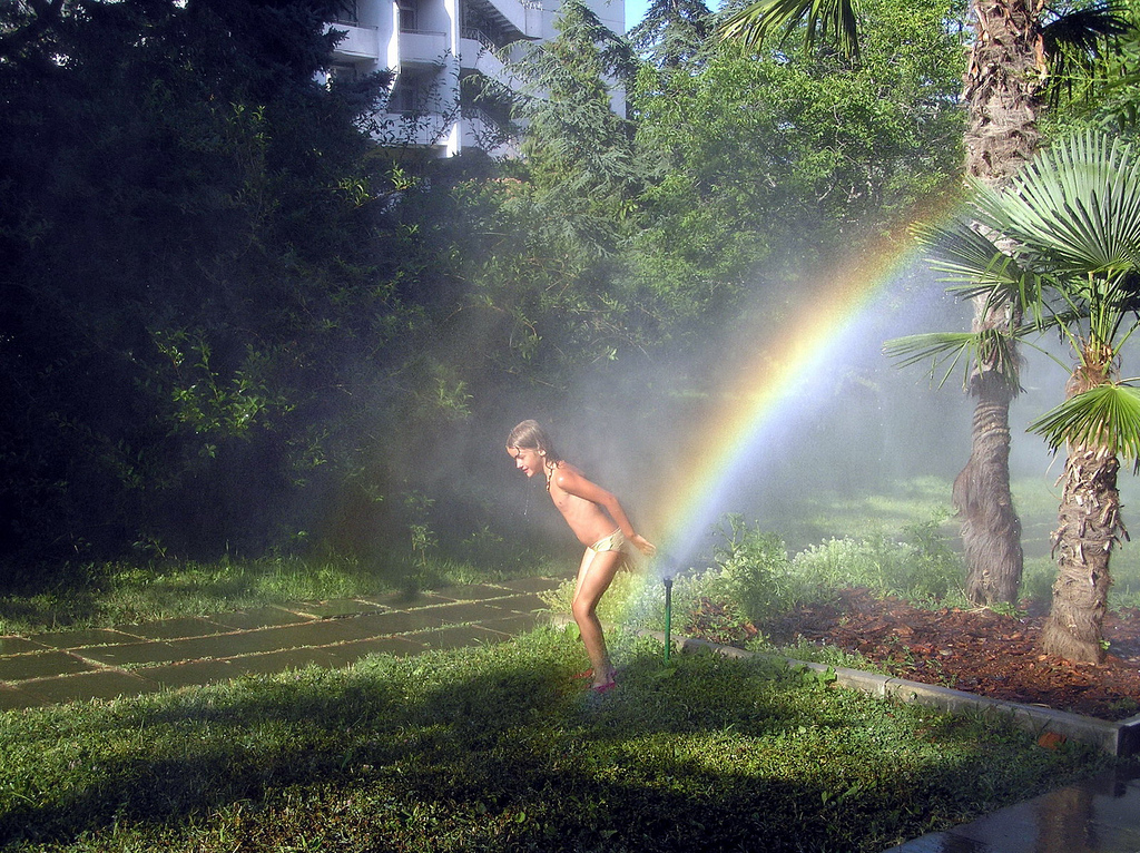 As a child, before my family put a pool in our backyard, my dad would turn the sprinklers on hot, sunny summer days for my sister and me to run through. Barefoot, we would run through the spray of the water, screaming and laughing. When the sun hit the water just right, a rainbow would form through the cold spray, making it feel like magic. Other afternoons in my grandparents’ yard, we would do the same, donning our swimsuits and running through the water as our grandparents looked on, smiling from the back porch. My grandmother had many wind chimes in her backyard garden, and on summer days, such as the one I described, they would always chime, moved by the occasional summer breeze. When I found this picture, it reminded me of childhood and the sounds that come with it, including the sweet wind chimes of my grandma’s garden. Alone, this image is not complicated, but a picture of a child having fun and playing in sprinklers with a beautiful rainbow forming behind. Paired together, this picture of a child playing in the spray of a sprinkler and the nostalgic sound of the wind chimes of my childhood create a bittersweet look at childhood for me. It reminds me of my grandparents’ house, which, after their passing, was sold and is no longer a place I can ever visit again, except in my fond childhood memories. The picture and sound together paint a picture of nostalgia and longing for childhood, something that is long over and only lives in memory.