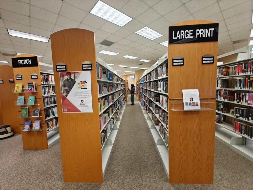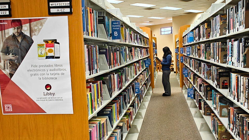 I took this photo at the West Hernando Branch Library. Every year, we have a list of photos we are required to take, one of which is of a patron browsing the collection (this is actually a staff member). The original is fine; it covers that requirement, but it does not follow the rule of thirds. Cropping the image, I aligned the subject along one of the vertical guidelines. The lines of the shelving units guide the viewer to the subject but also extend out towards the viewer. The prominence of the poster on the end cap was unintentional, but it makes for a creative promo image for Libby