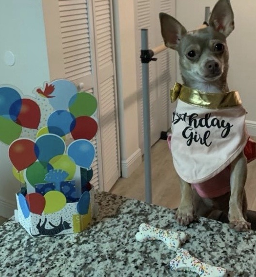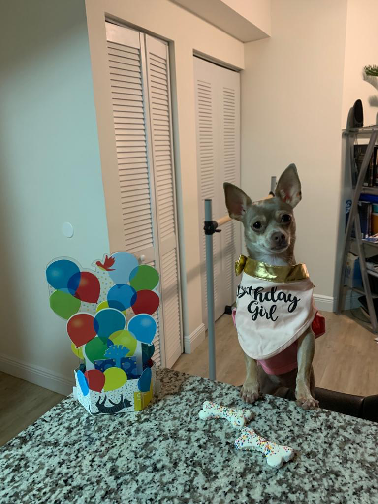 For this assignment, I created a derivative image by cropping an original photo that I took of my dog. The original image included extra background space and distracting elements that competed with her. In the cropped version, I used the Rule of Thirds by positioning her on the right third of the frame and keeping the birthday gift bag on the left third, creating a more balanced composition. The tighter crop also simplifies the background and strengthens the focal point, drawing attention to her expression and the birthday girl theme.
