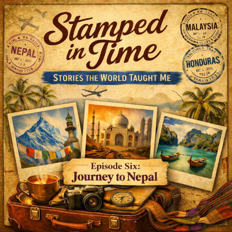 “Stamped in Time” AI Image generated using the prompt “A poster of a podcast highlighting travel stories from my trips to Nepal, Malaysia, China, India, Honduras, Ethiopia, and Australia. Use images of passport stamps and other travel gear. Episode six: Journey to Nepal”  by ChatGPT. February 2026