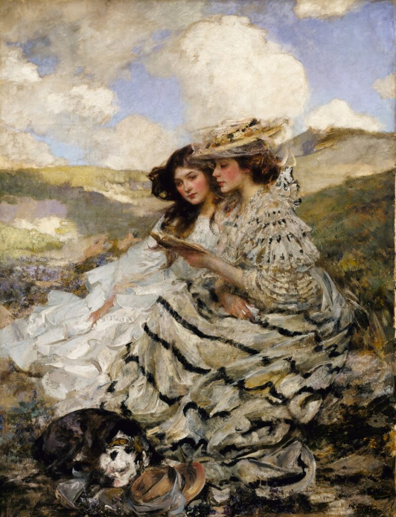 For this assignment, I chose the above image titled On the Dunes (Lady Shannon and Kitty) by James Jebusa Shannon. Shannon painted this portrait of his wife and daughter sometime around 1900 to 1910. I was drawn to this painting because it reminded me of being read to by my own mother. One of our favorites to read together was “Stopping by Woods on a Snowy Evening” by Robert Frost. I chose this audio pairing to evoke the feeling of being read to by a parental figure as illustrated in the painting. The painting becomes an experience when paired with poetry reading; in this particular work I am drawing on my own experiences and memories of childhood.